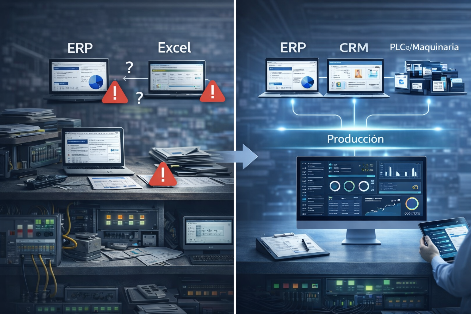 Conectamos máquinas, aplicaciones y procesos para quitar trabajo manual, reducir errores y dar control real a quien toma decisiones.